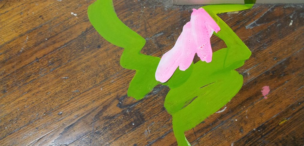 Using actual signwriter’s vinyl instead of book covering contact makes a huge difference to the possibilities of the work. With contact, the vinyl paint doesn’t adhere very well and ends up peeling off – unwanted paint skins. It’s also a bit rubbish at adhering to walls and floors. It was good for testing ideas early on though. Now I have been able to stretch out in my studio, rolling out metres of vinyl, pouring great globs of paint and then brushing it around with a broom. Yes. A broom. I found one with lovely long bristles and I can push the paint around from a standing position with it’s long-enough handle. Painting onto the floor arose out of need, to avoid runs and drips in my brushstrokes. This way, the paint stays where I put it.