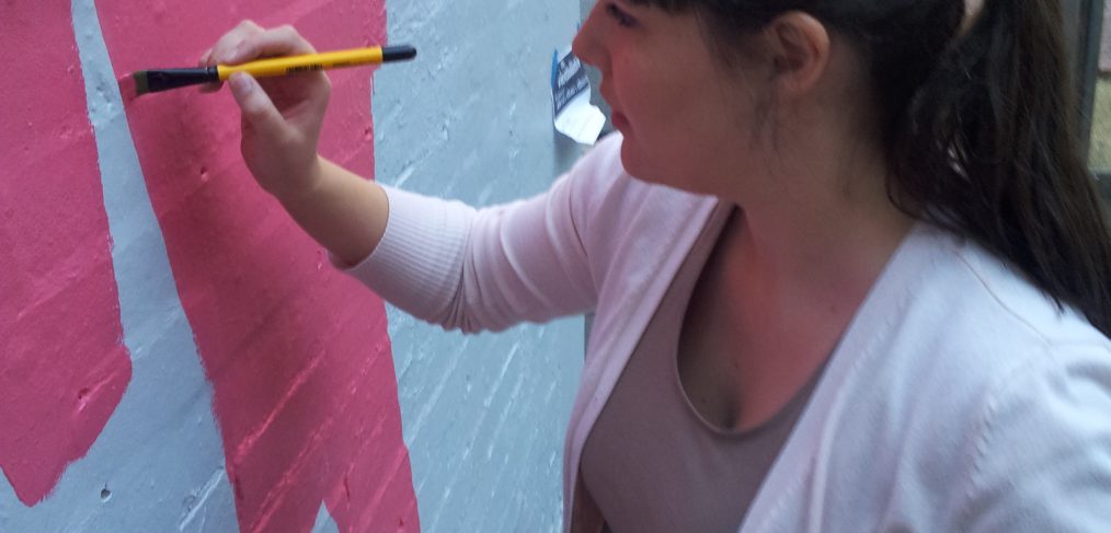 The first site, is at Mason St Newport.  And outdoor site, brick wall and asphalt footpath.  Once the previous artwork was removed from the wall, it revealed what I had to work with; a painted brick wall, with some damage.  I painted it a pale grey all over for the base coat.